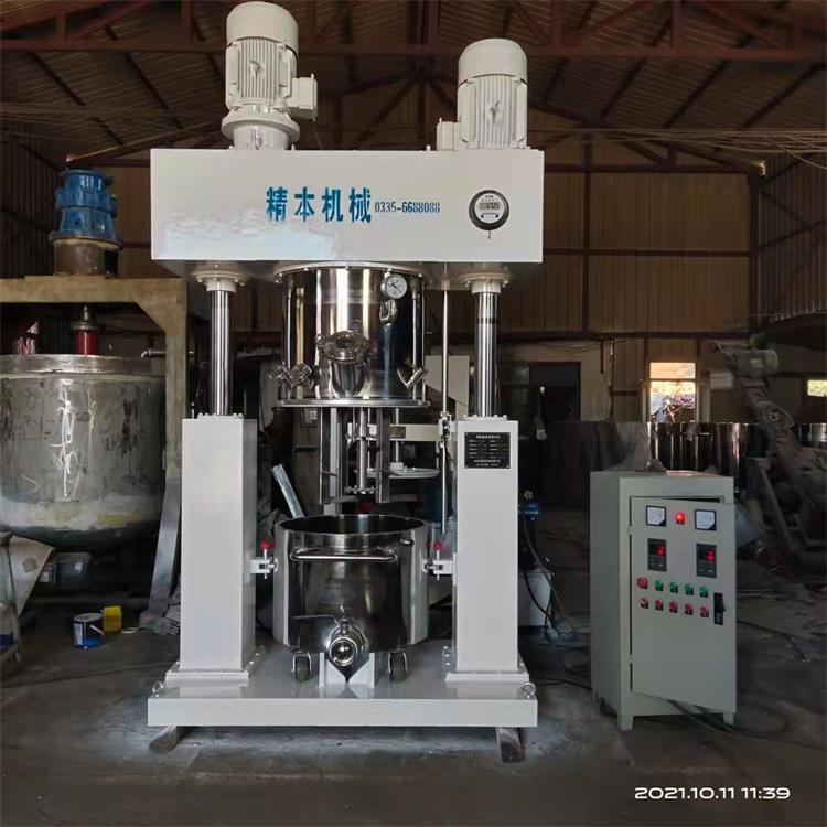 雙行星攪拌機根據行星運動軌跡設計,攪拌結構有低速攪拌器、高速攪拌器、以及相應的刮板裝置組合而成。雙行星攪拌機的雙組低速攪拌器自轉的同時繞著軸心進行公轉,而且低速攪拌器的形式根據不同的物料粘度和生產工藝選擇不同的攪拌形式,常見的攪拌形式包括槳葉式、麻花式、爪式、框式等結構,具備良好的混合、反應、捏合、溶解的作用;高速分散器由多層具備極高線速度的鋸齒狀分散盤組成,它同樣在高速自轉的同時繞著軸心進行公轉,能夠將粉料(助劑)快速的分散到漿料里,具備很強的分散作用;刮板裝置根據客戶實際的生產工況選配。